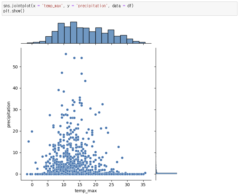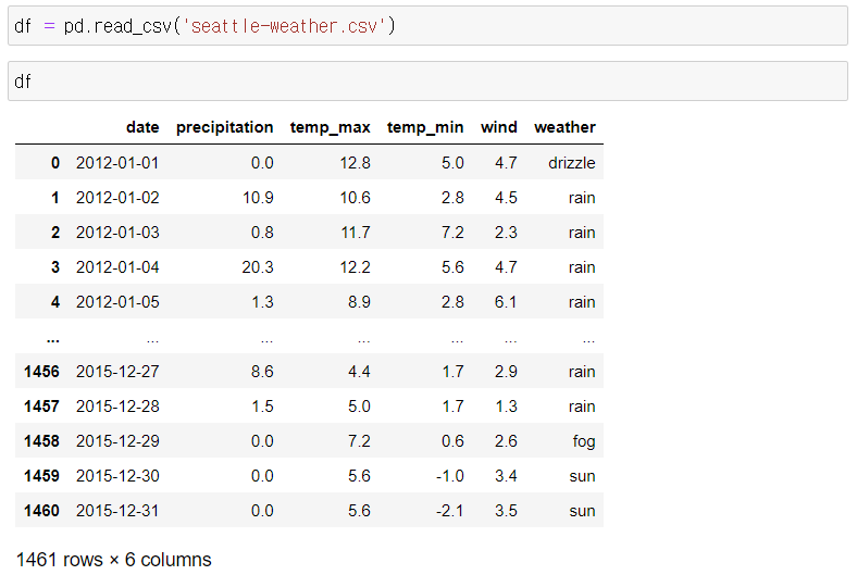 - date, precipitaion, temp_max, temp_min, wind, weather 여섯 개의 컬럼으로 이루어짐.
