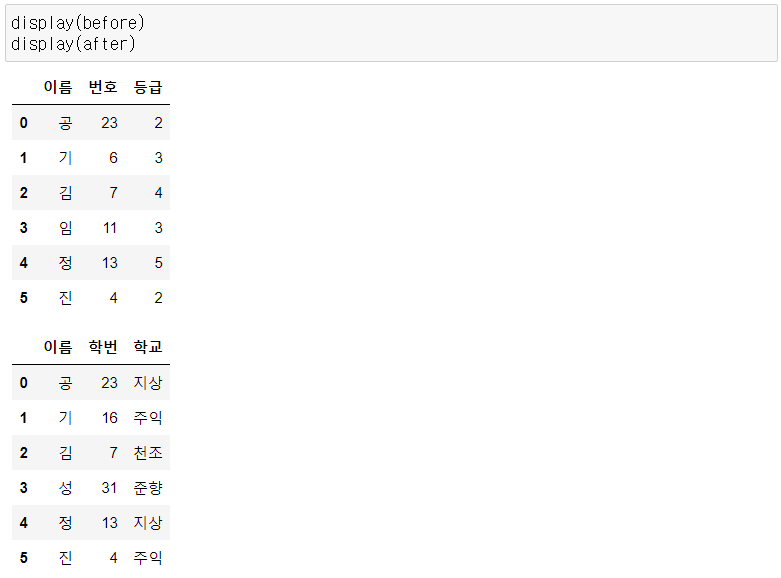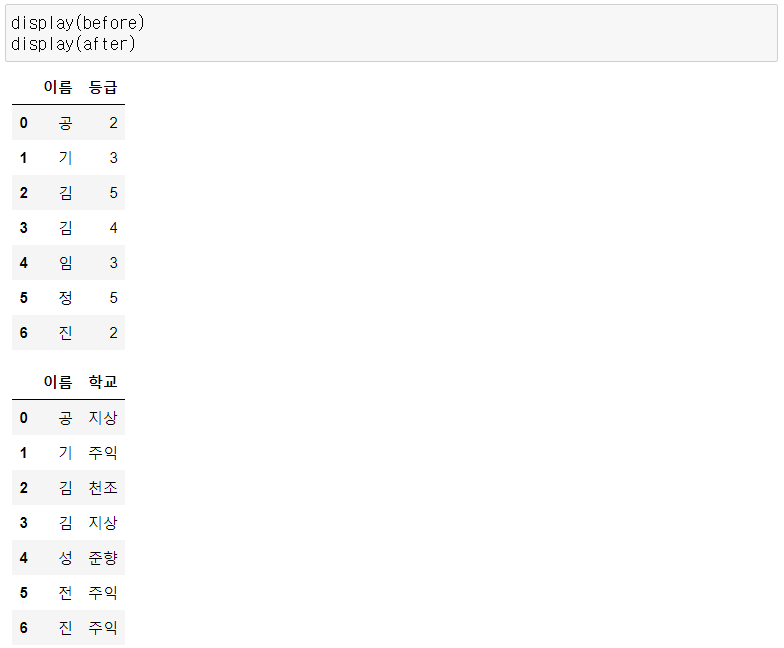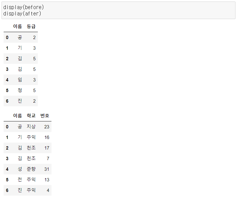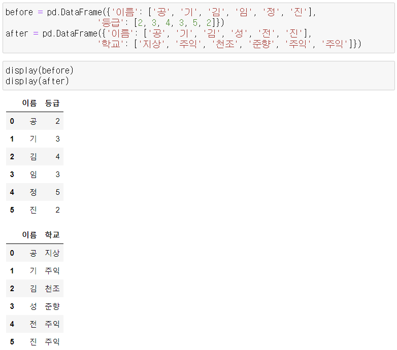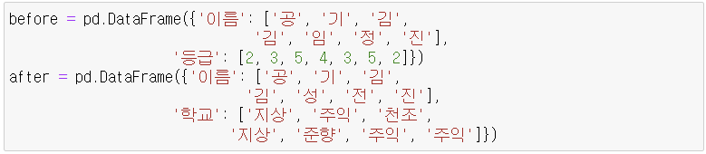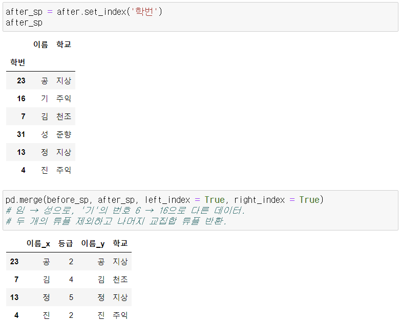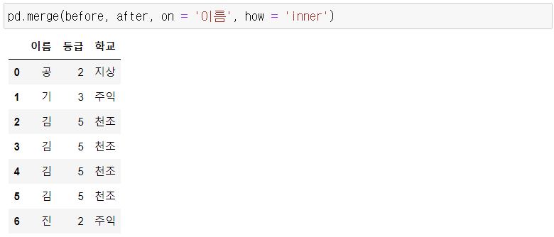 - right: 두 번째로 쓴 데이터프레임.(두 개 기준. 세 개 이상은 순서에 따라 정렬)