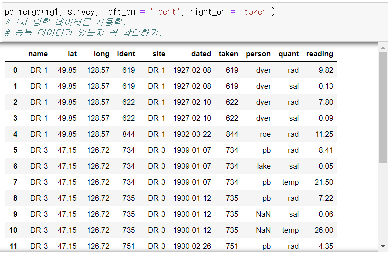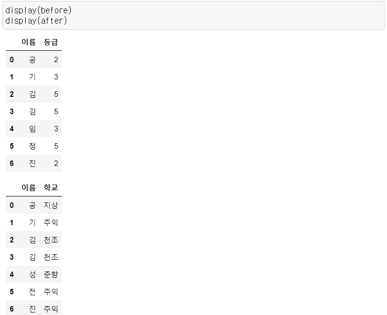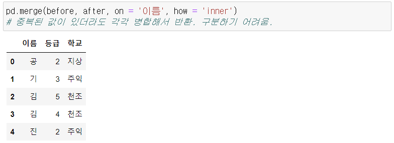 - 어느 데이터프레임을 left로 둘지, inner, outer 무엇을 선택할지는 데이터베이스 설계 개념을 이해해야 한다.