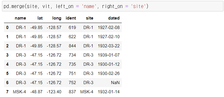 - left: 왼쪽 데이터프레임의 join key 기준 병합.