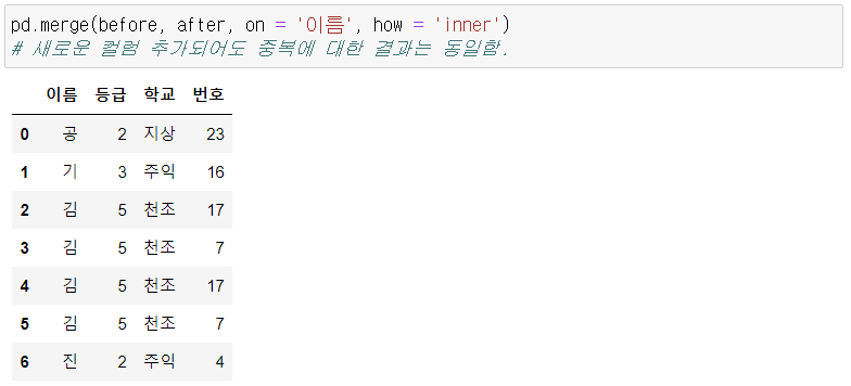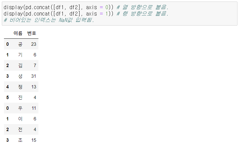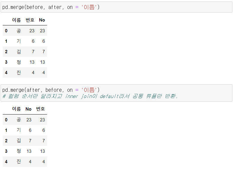 - 잘 병합되려면 데이터프레임 쉐입, 공통 컬럼 등 많은 고려가 필요함.