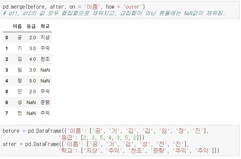 - outer: 양쪽 데이터프레임의 join key 기준 병합.