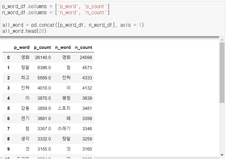 - 상위 20개의 단어를 확인한 결과 영화, 점, 진짜, 이, 것 등과 같이 긍부정을 파악할 수 없는 단어가 많이 존재함.